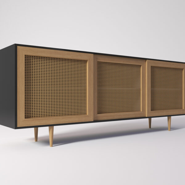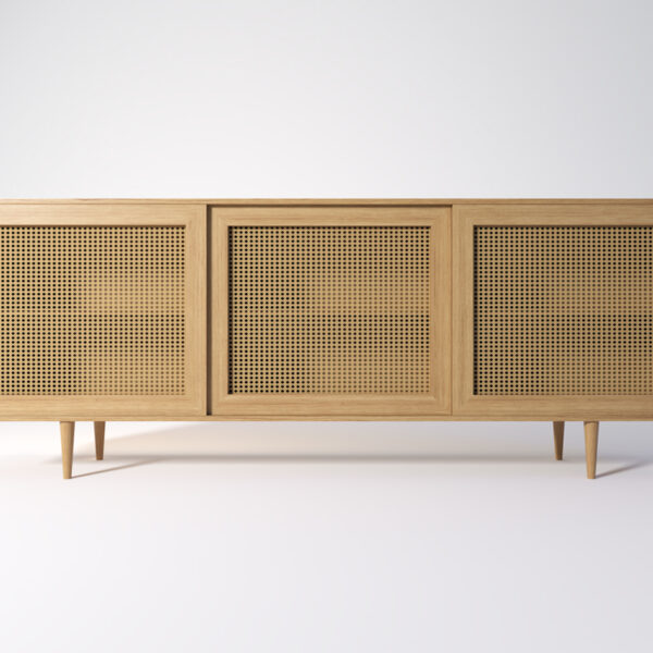 The 3 Door Server features solid oak soft-close doors with rattan inlay, solid oak legs fitted with non-marking glides, and interior adjustable shelves with a hanging rail for flexible storage. It is equipped with Hafele running gear, knurled solid brass knobs, and finished in Osmo 2K oil for lasting protection and natural appeal.