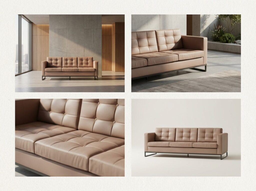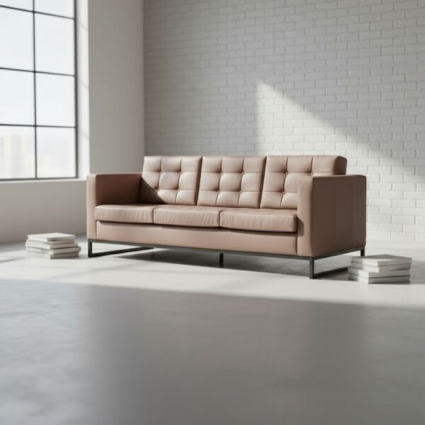 Loose base and back cushions with button detail and a metal square tubing frame. Other base options include a wooden leg frame or chromed sofa legs.