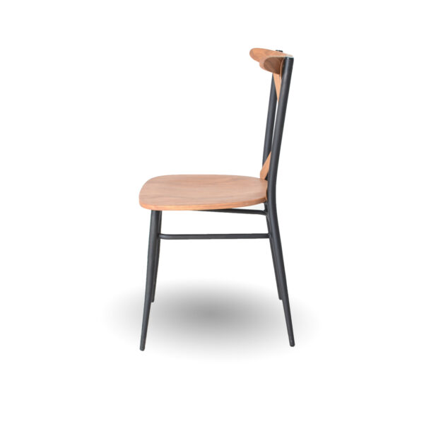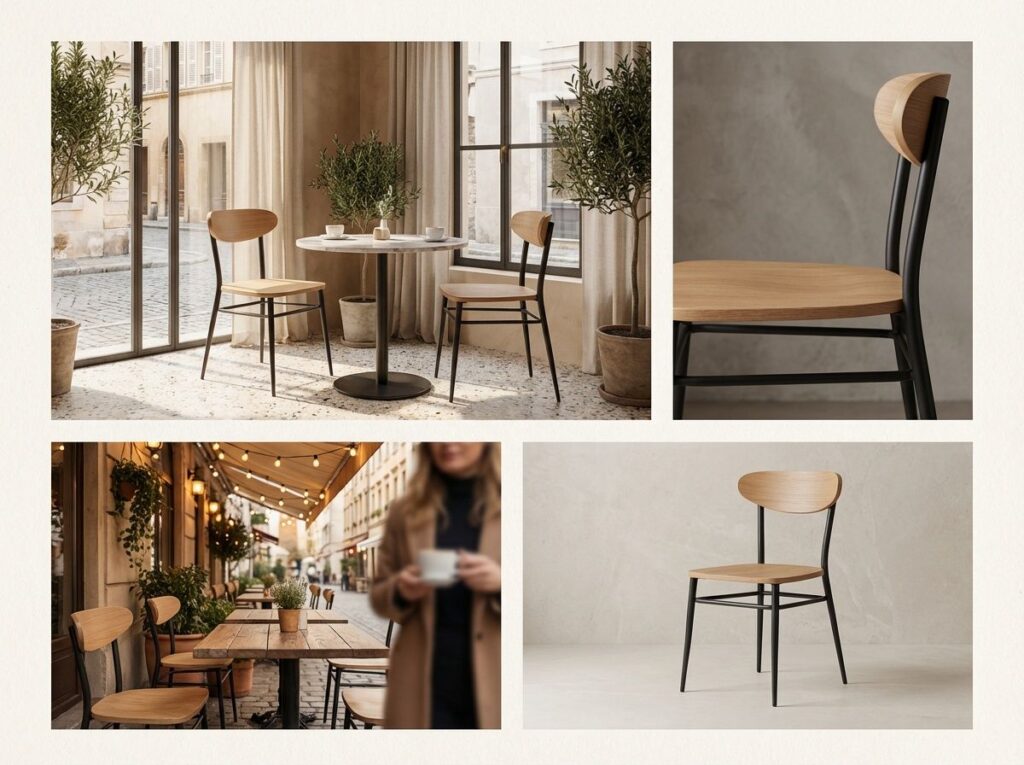 Versatile bistro chair with a durable steel frame, available in three distinct back styles. Choose between a fabric-upholstered or wooden seat for a tailored look that blends style with lasting comfort.