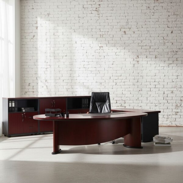 Veneer 32 x 2mm flat solid edge top with anthracite backer & curved laminated modesty panel, curved 50mm legs.