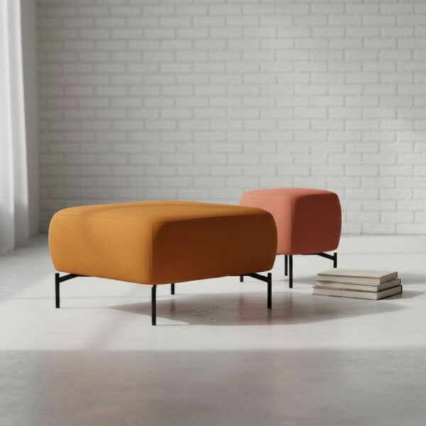 Upholstered ottoman made from high density foam, featuring steel legs, available in various powder coat finishes. Two sizes available.
