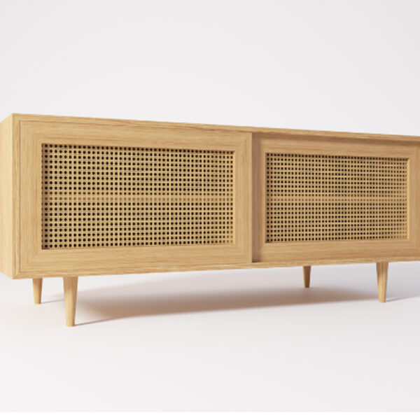 The Compact Media Unit features solid oak soft-close doors with rattan inlay, supported by solid oak legs with non-marking glides. It includes adjustable shelving, a hanging rail, knurled solid brass knobs, Hafele hardware, and a protective Osmo 2K oil finish for durability and refined texture.
