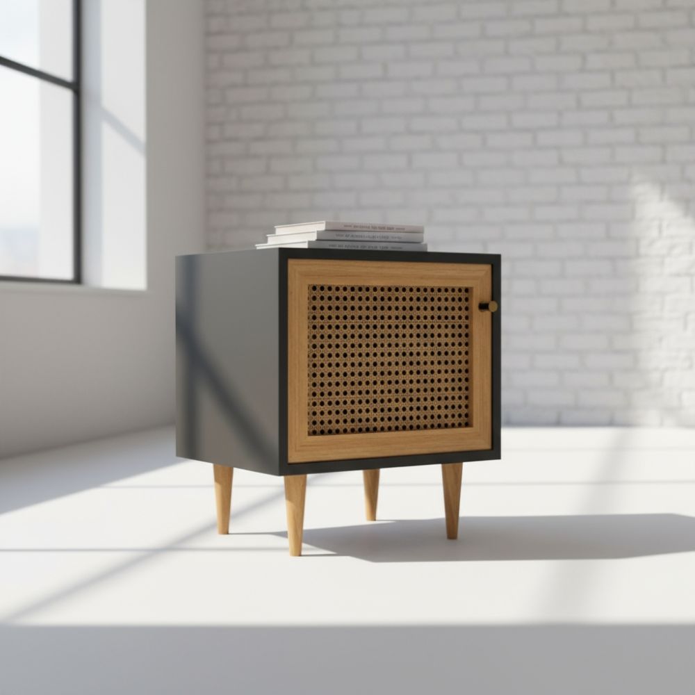 The Draw Pedestal includes solid oak drawers with rattan inlay, solid oak legs with non-marking glides. It features knurled solid brass knobs and an Osmo 2K oil finish that enhances durability and natural character.