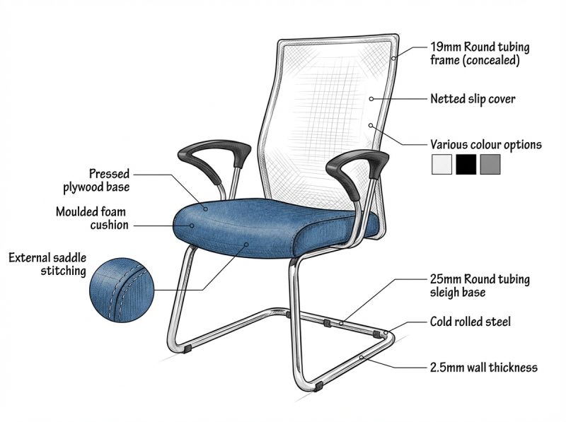 Back: 19mm Round tubing frame (Cold rolled steel – 1.6mm thickness) | (100x8mm) bottom support brace | Netted slip cover covering framework