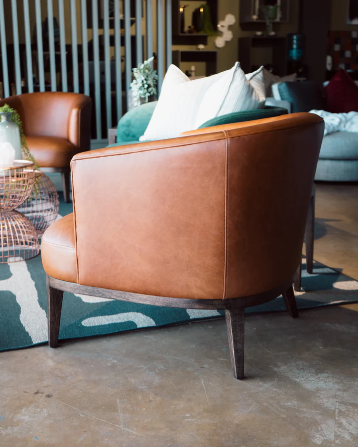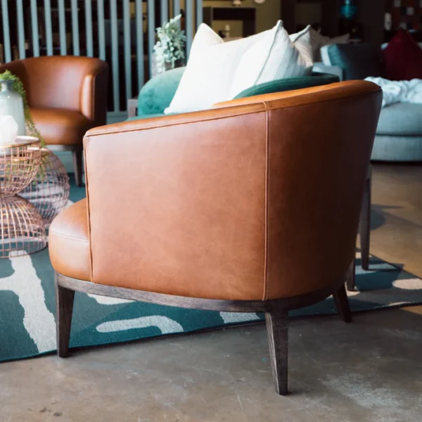 The Induduma Chair is a refined accent piece that combines contemporary design with timeless comfort. Crafted with a sleek, curved silhouette, this chair features rich, cognac-coloured natural leather upholstery that provides a luxurious feel. Its deep seat and supportive backrest offer both style and relaxation, making it perfect for lounging or entertaining.