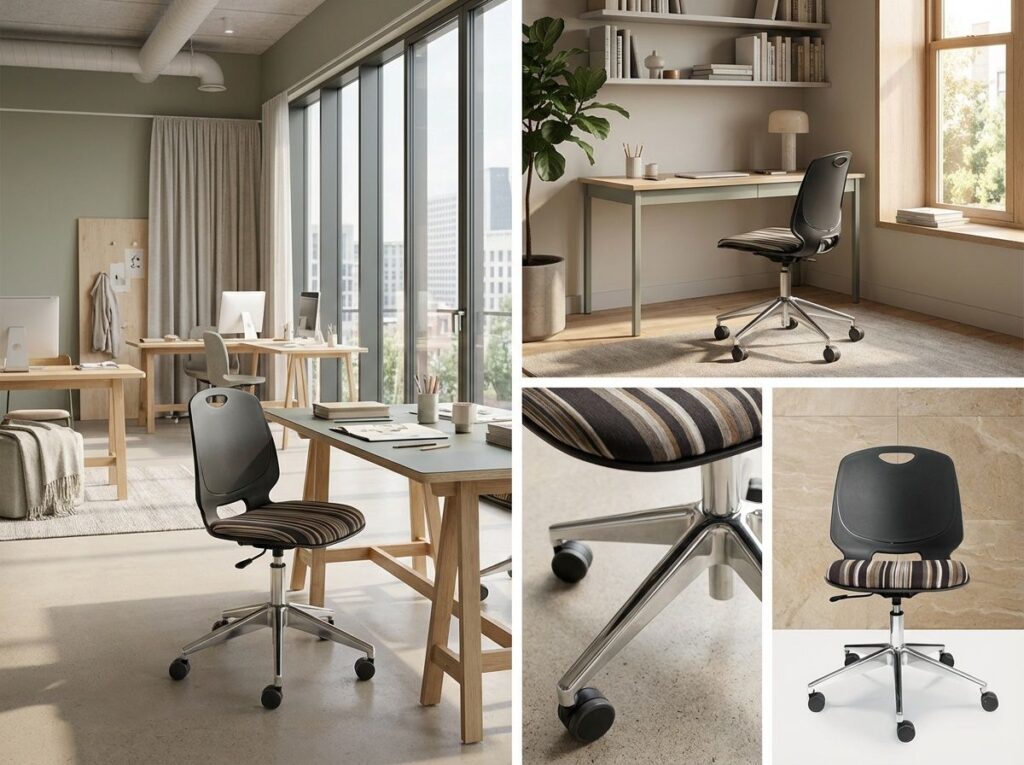 Polyprop shell on five star castor base with swivel and gas height adjustment. Choice of polished Aluminium or Black Nylon base finish. Optional upholstered seat panel.