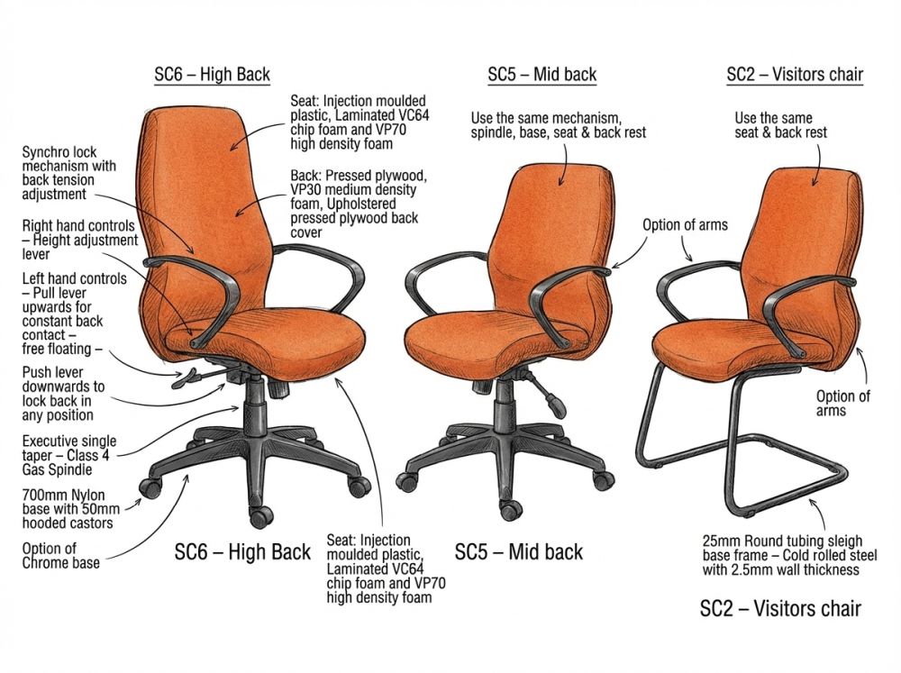 Seat: Injection moulded plastic. Laminated VC64 chip foam and VP70 high density foam.