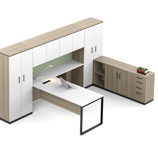 Executive two x hinge-door cabinets, executive worktop, overhead storage in glass or wood with pinboard and executive pedenza cabinet.